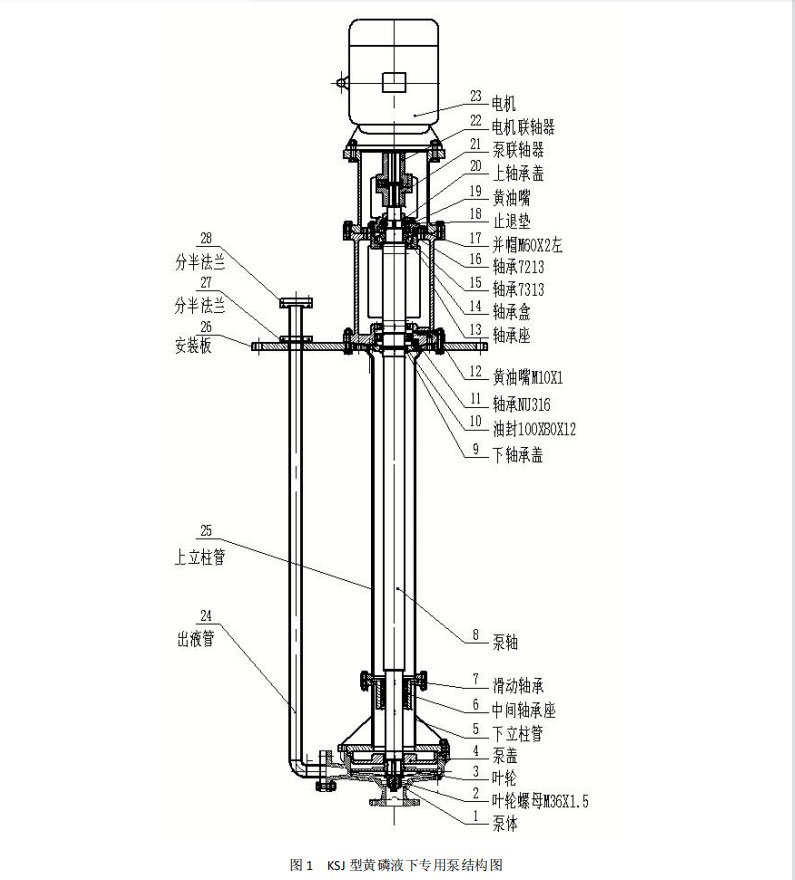 1、KSJ型黄磷液下专用泵主要零部件有泵体、叶轮、出液管立柱管、泵轴、轴承压盖、安装板、泵轴、轴承座、电机架、联轴器、电机。